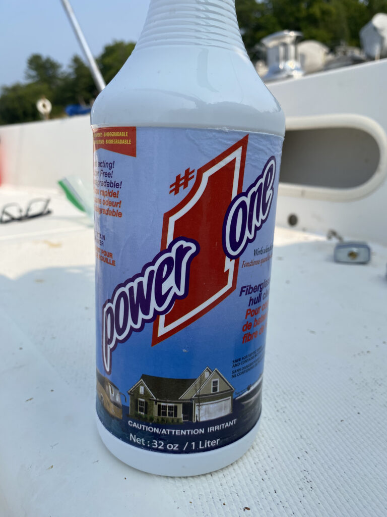 I wasn’t super keen on re-waxing the hull as the it was getting about mid-season here, so I didn’t want to waste any more time, so I went looking for an alternative. At my local sailing store, I was told about this cleaner called Power One, they promised it would effortlessly remove the Alge gunk.