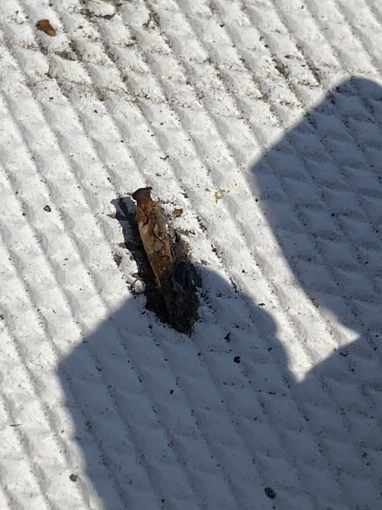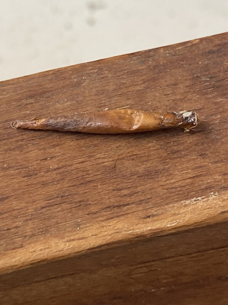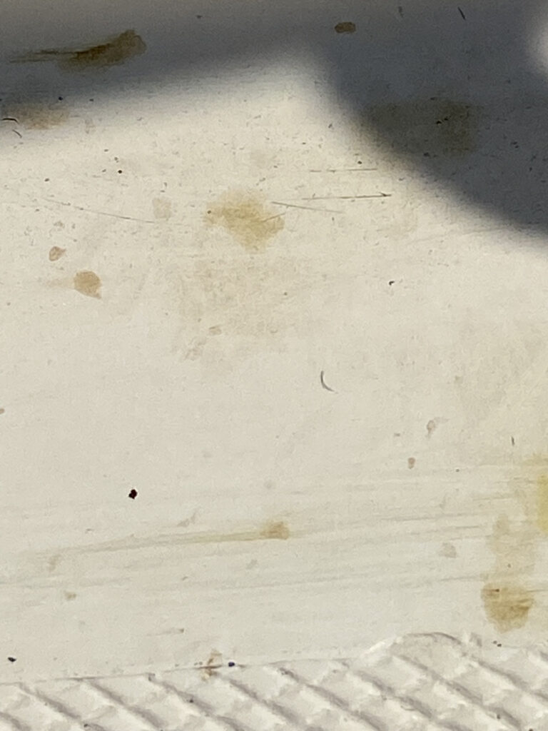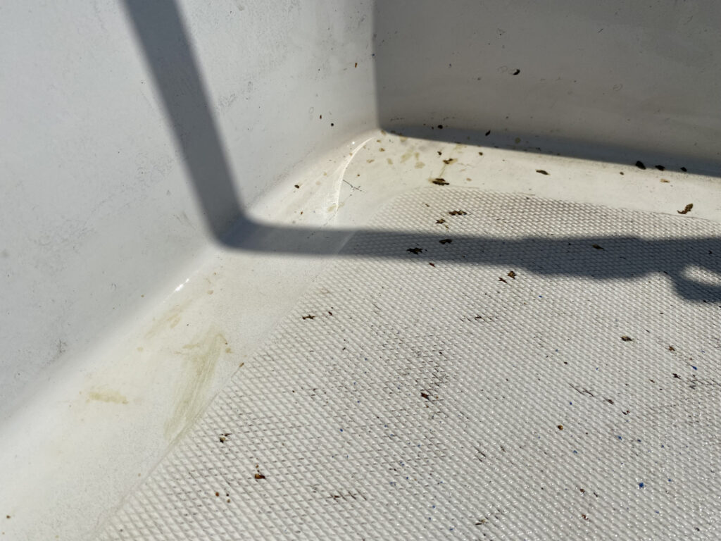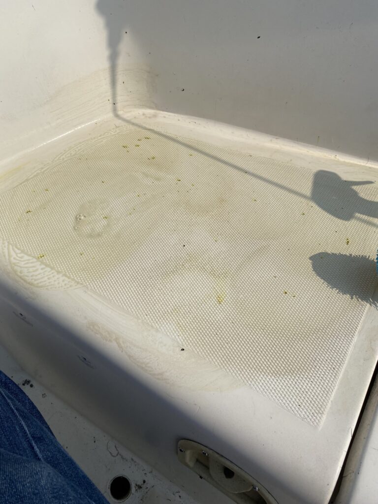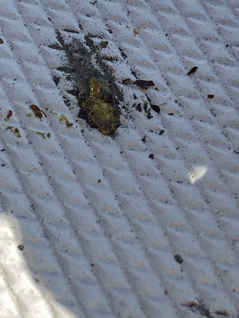 They’ve oozed some resin like liquid that has glued them to wherever they landed. Now, I can scrape them off which does leave a bit of it behind. This bit and the resin are difficult to remove. The only thing that has worked so far is scrubbing with a Javex brand scrubbing pad on a handle. I’ve nearly worn through a scrubbing pad, and I haven’t even gotten the bit of the bench behind the port locker top clean yet. When I’ve managed to get the bud bits and resin scrubbed off there is a greenish stain left.
