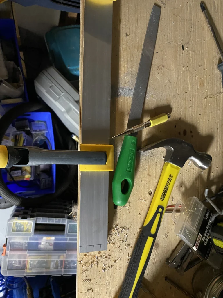 With the flat bar purchased I cut it to length using a hack saw, drilled 2 holes in each end and mounted it to the panel. Simple right, wrong. First off despite drawing a straight line using a framing square, cutting slowly I still somehow managed to cut at a slight angle. Second, despite what you might read or be told, a nail set does not, I repeat, does not work as well as a centre punch. After 2 holes drill slightly off, I headed out and purchased a centre punch.